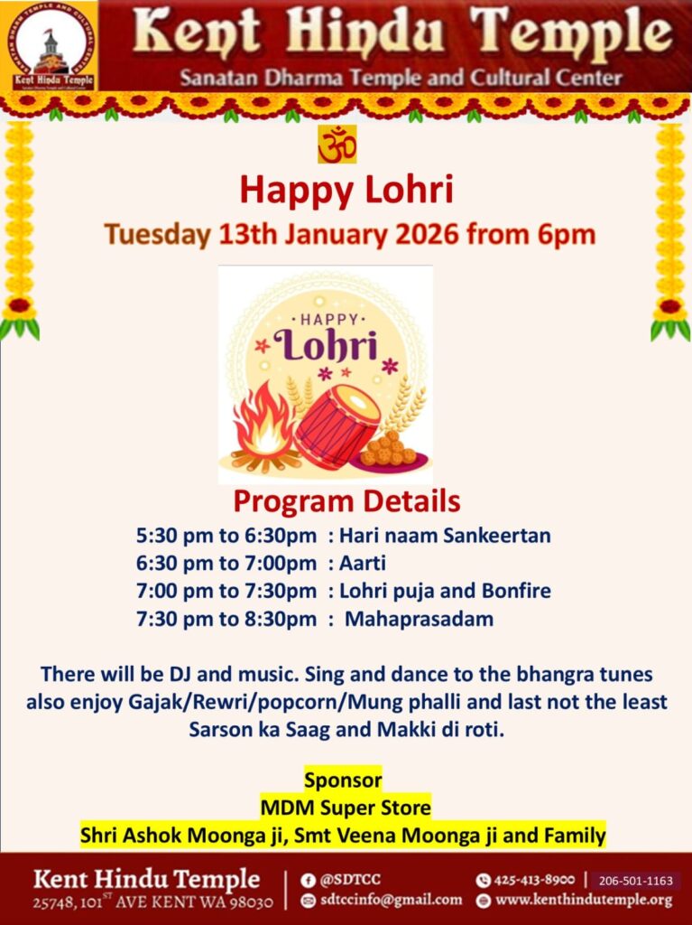 Events Lohri – Jan 13th, @ 6pm RUDRA ABHISHEKAM – Every Monday HANUMAN CHALISA – Every Tuesday Note: Please consider volunteering & sponsoring dinner plates, flowers, napkins, spoons for the upcoming events.